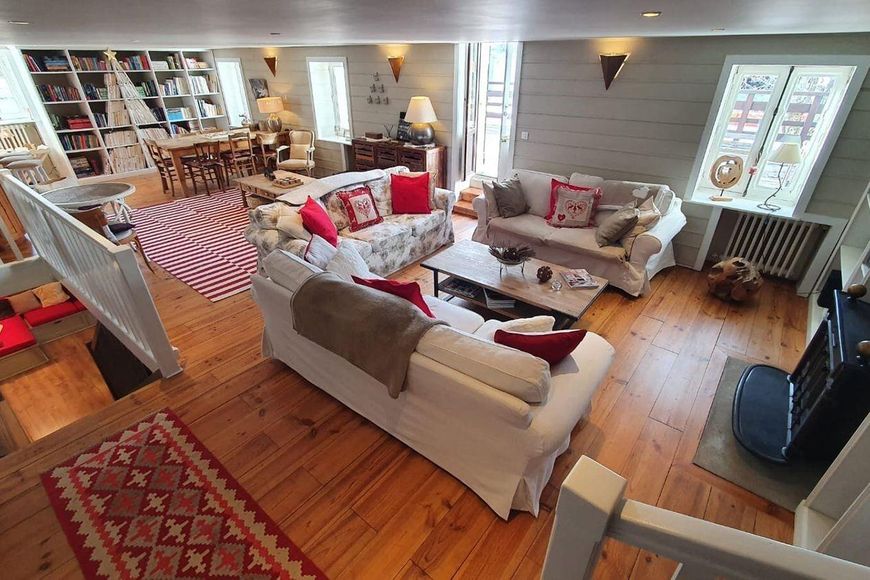 - Living area with kitchen, dining area, fireplace (firewood), bar, library, sofa, TV and table football