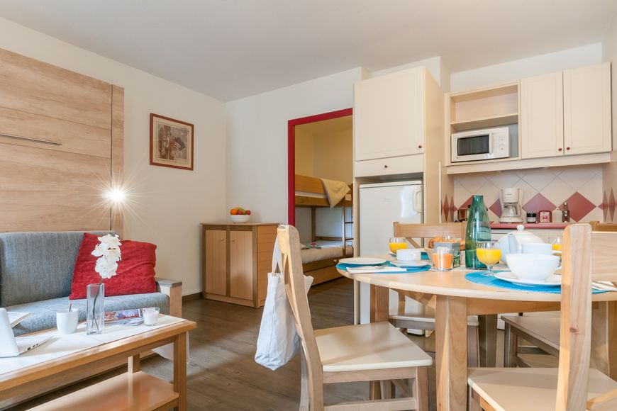 The friendly-furnished studios and apartments have a bath or shower/wc with hair dryer (free rental at the reception, upon availability), a living/sleeping area with TV, Wi-Fi (limited transmission rate), sometimes separate bedroom as well as a fully furnished kitchenette with hob, refrigerator, dishwasher, microwave and coffee machine. Some have a balcony or terrace. Allocation can take place in both the "La Rivière" as well as the "Les Aiglons" buildings.