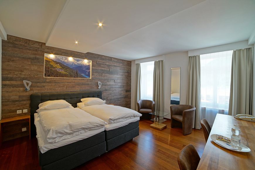 - Room with double bed, 2 addl. beds in a visually separated sleeping area, TV, telephone, safe and mini bar (for a fee).