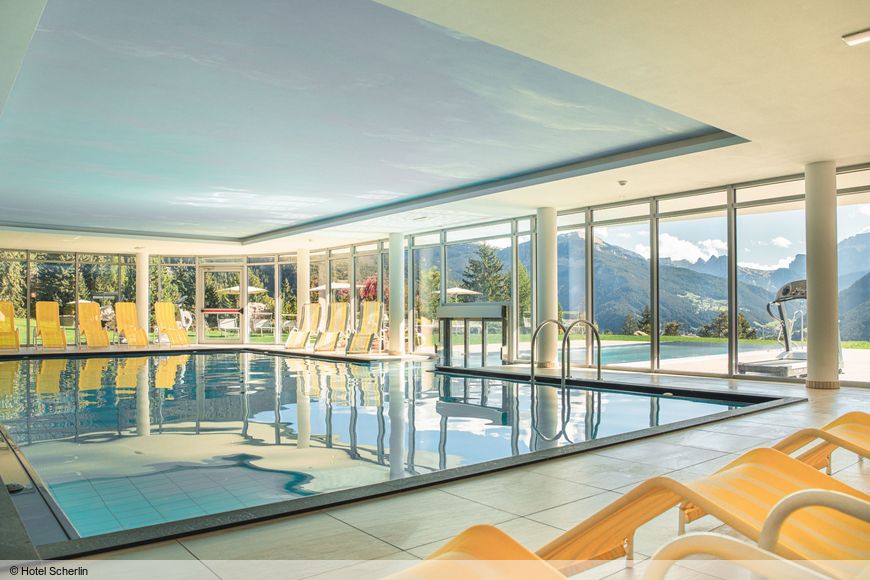 The cosy 3-star Hotel Scherlin is located at an altitude of around 1,400 m in a wonderful panoramic position, approx. 5 km from the village centre of Ortisei and the ski lifts. The ski bus stops directly at the hotel. Castelrotto is about 6 km away (Alpe di Siusi). Shopping facilities as well as a toboggan run and cross-country ski run are about 5 km away.