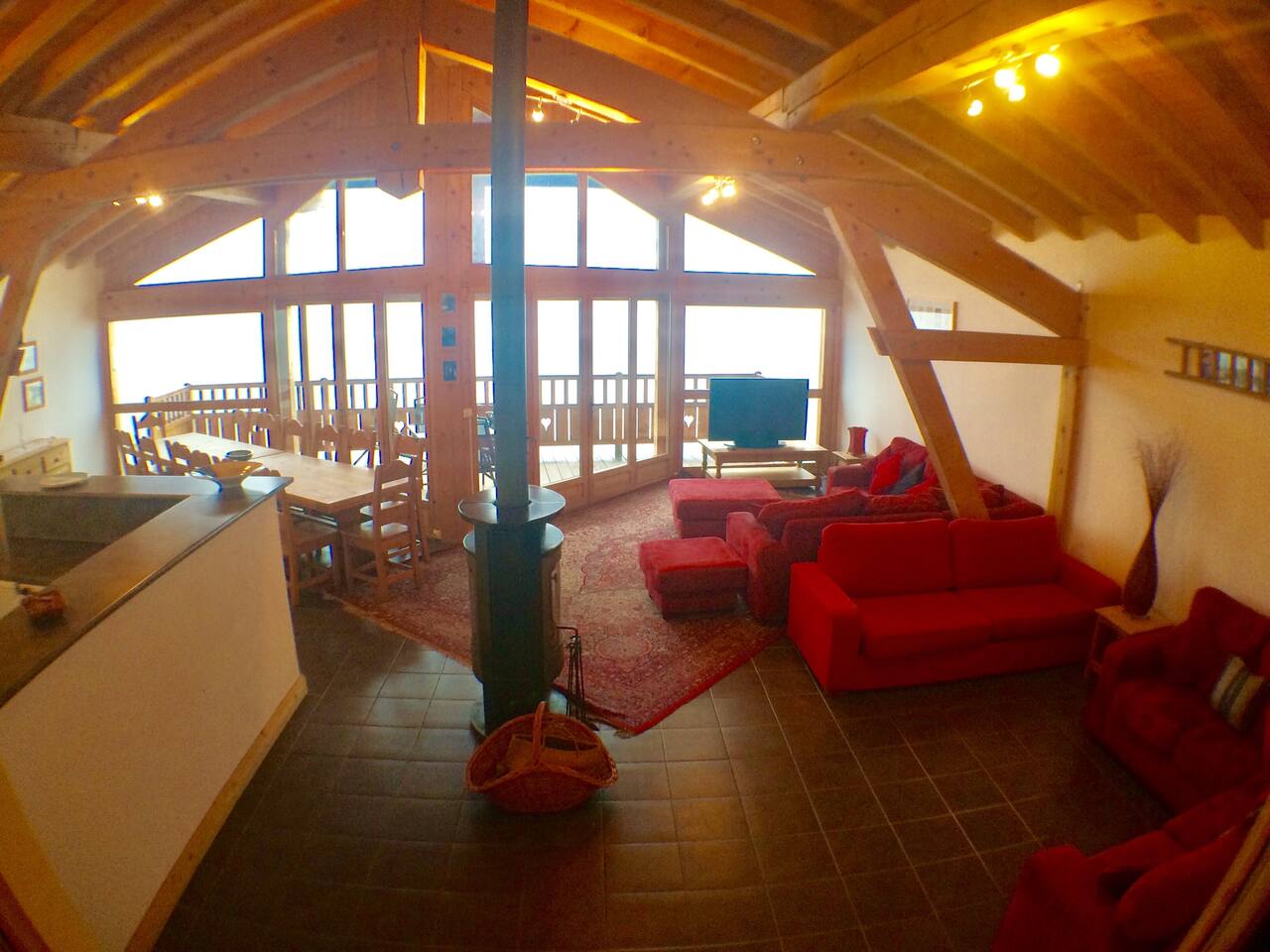 For relaxing after a day's skiing we have a large, comfortable sitting area, arranged round a wood burner/TV/DVD, large dining area and a fully-equipped modern kitchen - all on one floor so a great social space for a group. Full height south-facing glass doors and a balcony run the length of this floor.