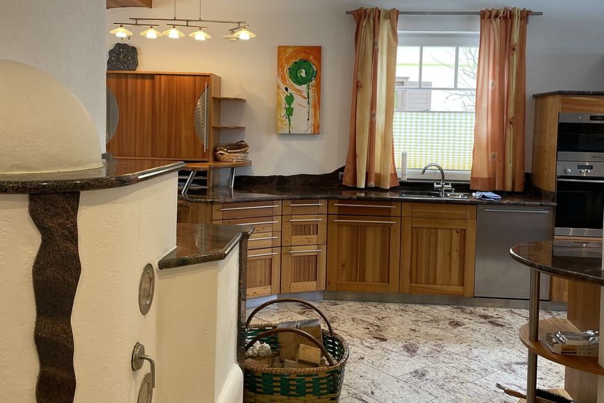 - Kitchen with wood hob, ceramic hob oven, dishwasher, fridge with freezer compartment, coffee maker, kettle and toaster.
