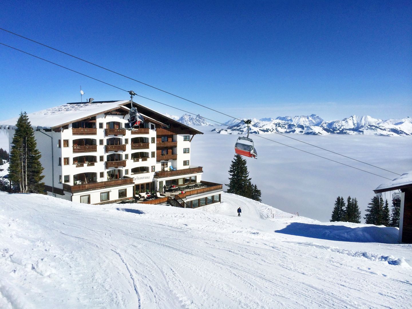 Arrival at the accommodation is only possible via the "Fleckalmbahn" gondola valley station in Kirchberg. You can park your vehicle in the parking garage of the valley station (for a fee). Once at the mountain station, you can reach the hotel after about a 3-minute walk. On request and for a fee, you can leave your luggage at the valley station to be transported to the hotel. The last ride up the mountain is at 16:30 - arrival at the hotel after that will not be possible!
