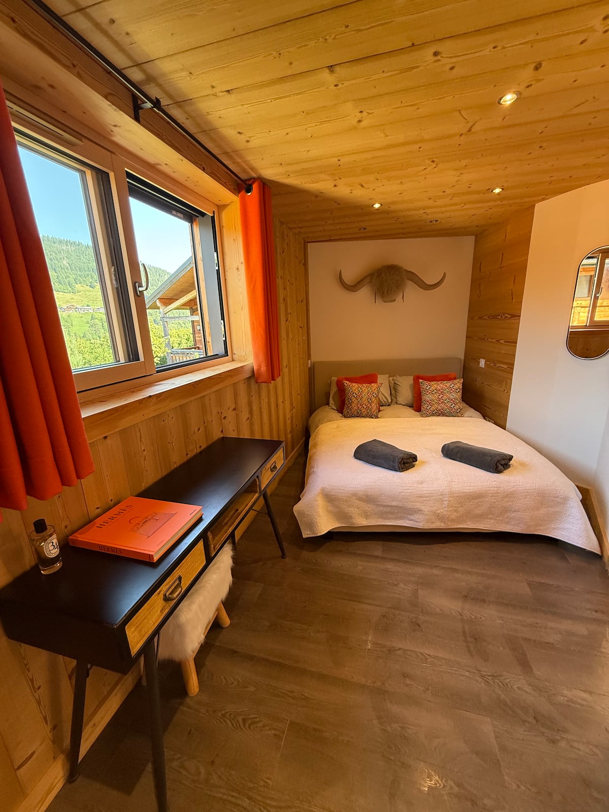 - King-size bedroom on the same floor with built-in wardrobes, blackout blinds and Mont Chéry views