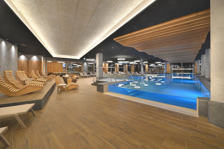 The complex also has a 3,000 m² panoramic spa area with Infinity pool area with indoor and outdoor pool and hydromassage chairs as well as a pool bar, kiddie pool with two slides and a sauna area with panoramic sauna, organic sauna, Turkish steam batth, Kneipp facility, three relaxation areas and cold water pool (opening hours as per info in resort). This area, as well as the fitness area, can be enjoyed for free. Massages and beauty treatments can be booked on site for a fee