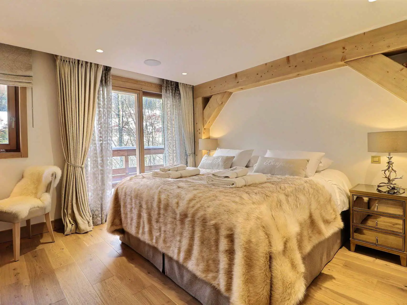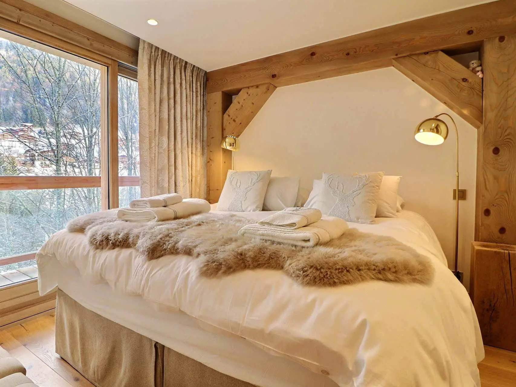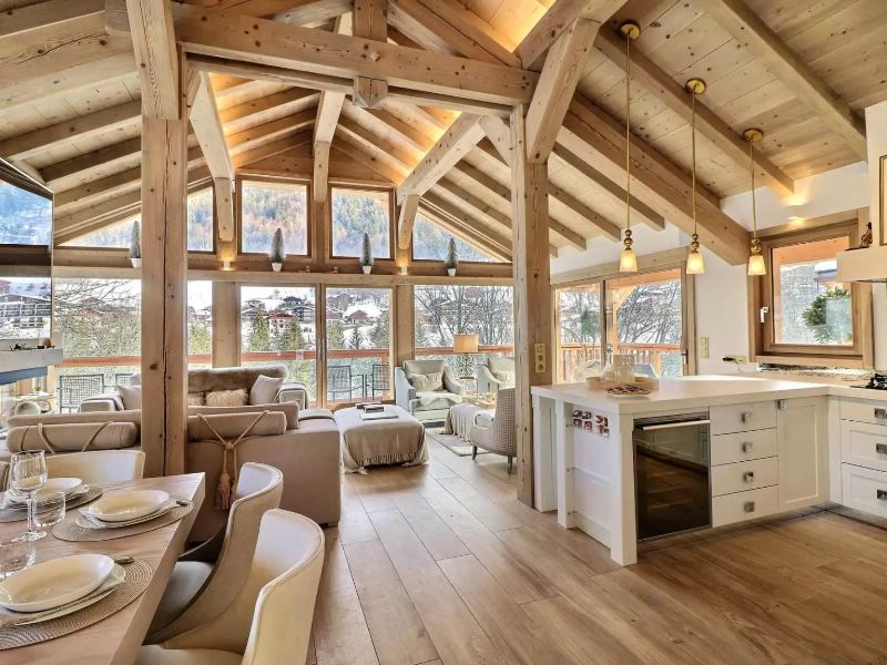 The open plan living room has a vaulted ceiling and panoramic windows giving a feeling of light and space. There is nothing in front of the chalet other than trees and the mountain view.