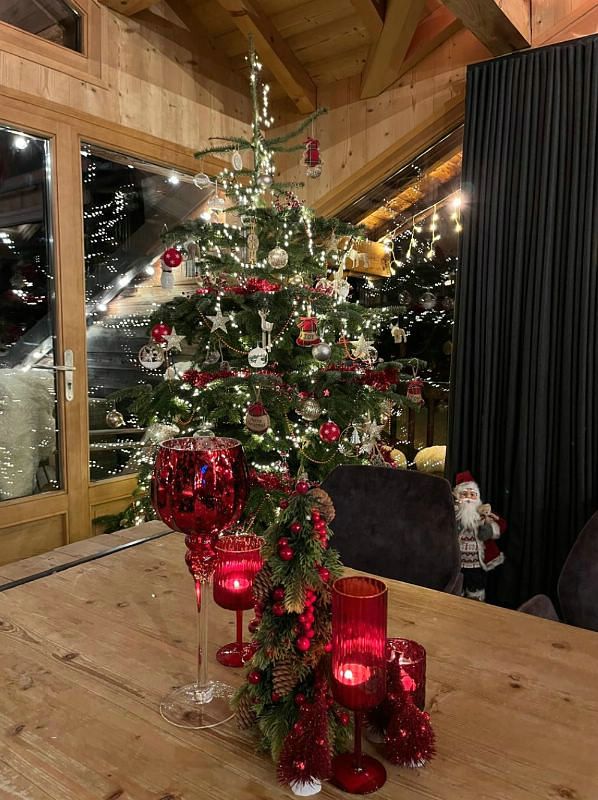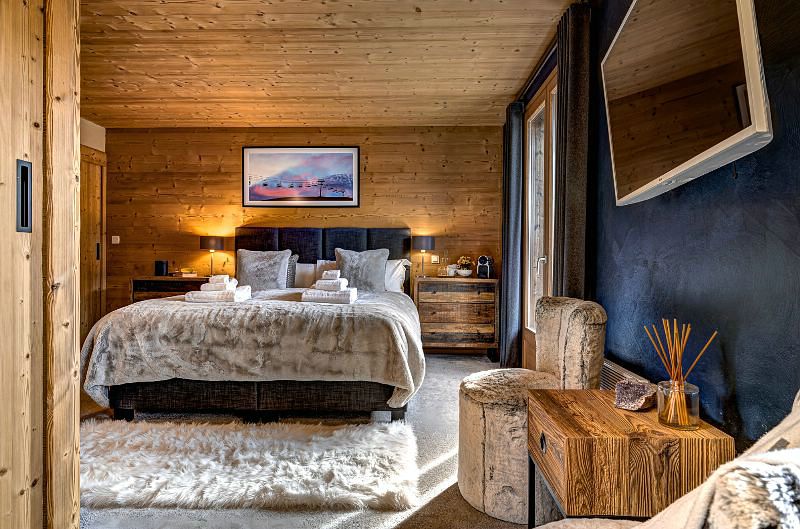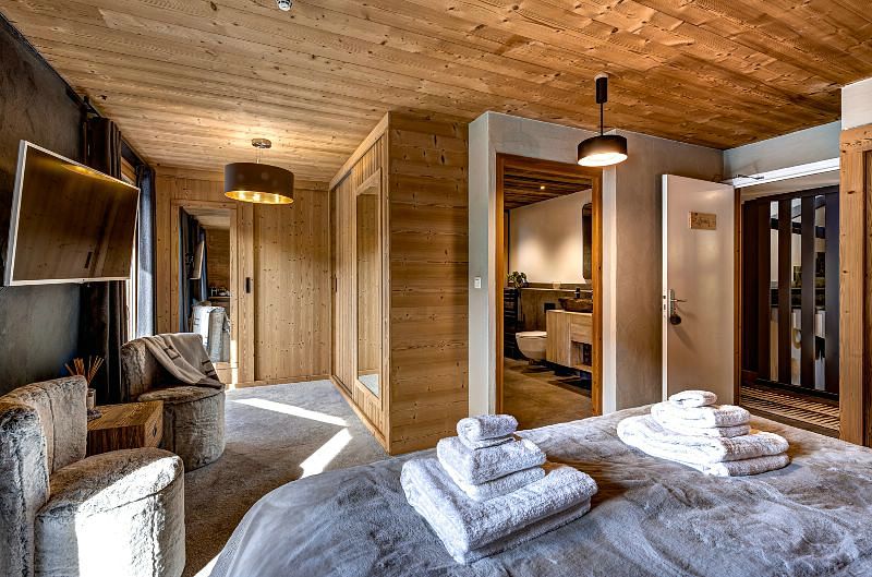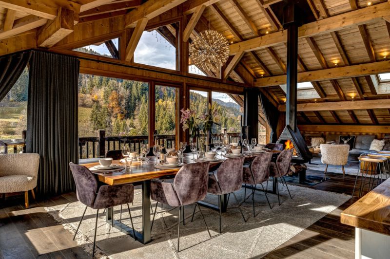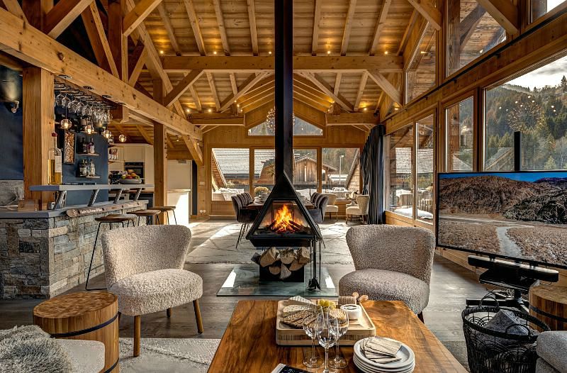 Laid out over three floors, the chalet showcases striking architecture and beautifully designed interiors that blend natural wood, soft lighting, and modern elegance. The top floor features a large open plan living area, providing an inviting space for relaxation. A suspended fireplace brings real cosiness to the room in the evenings. The space also includes a spacious dining area surrounded by double-height, floor-to-ceiling windows that look out onto the mountains, and a fully equipped kitchen - perfect for social evenings after a day on the slopes.