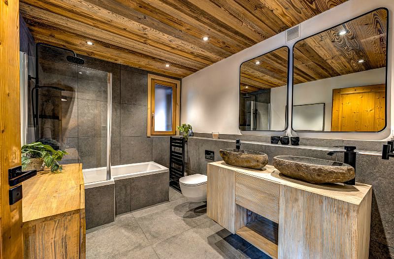 The middle floor offers seven stylish bedrooms, all with en-suite bathrooms. Some rooms have balconies that feature charming views across the surrounding peaks and forests. Step outside onto the outdoor terrace, where you can unwind in the private hot tub and take in spectacular views of the Morzine valley and surrounding mountains.