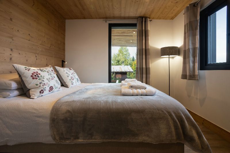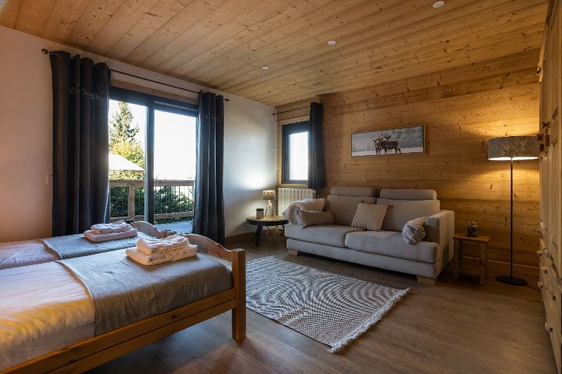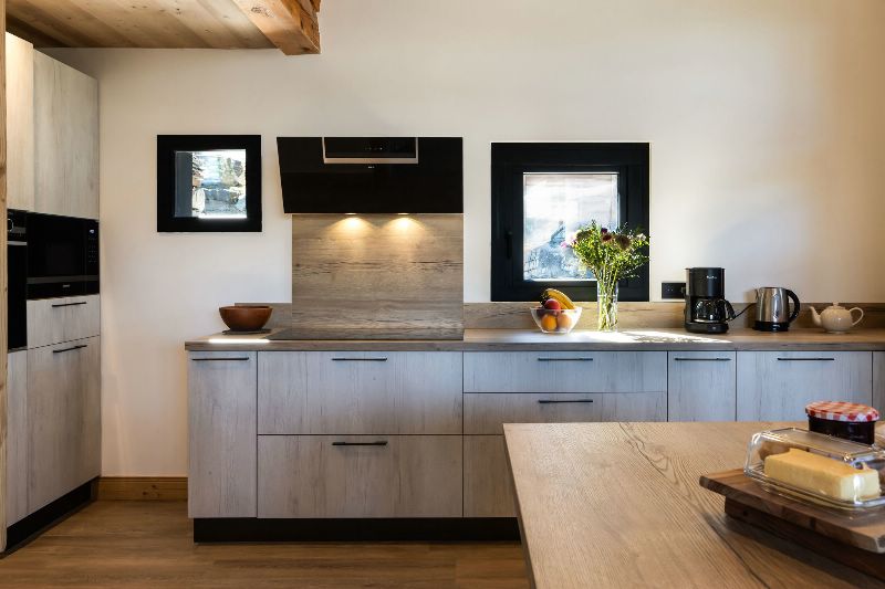 Experience alpine luxury at Chalet Mathilde. As you enter the chalet there is an open plan lounge/kitchen/dining space that leads onto a private balcony with stunning views of the mountains. This floor provides ample space for relaxtion and dining, making it ideal for groups seeking comfort and convenience. It has a large spacious lounge with contempory sofas and a separate dining area to sit 14. It also provides access to bedroom 1, the boot room and a separate w/c.