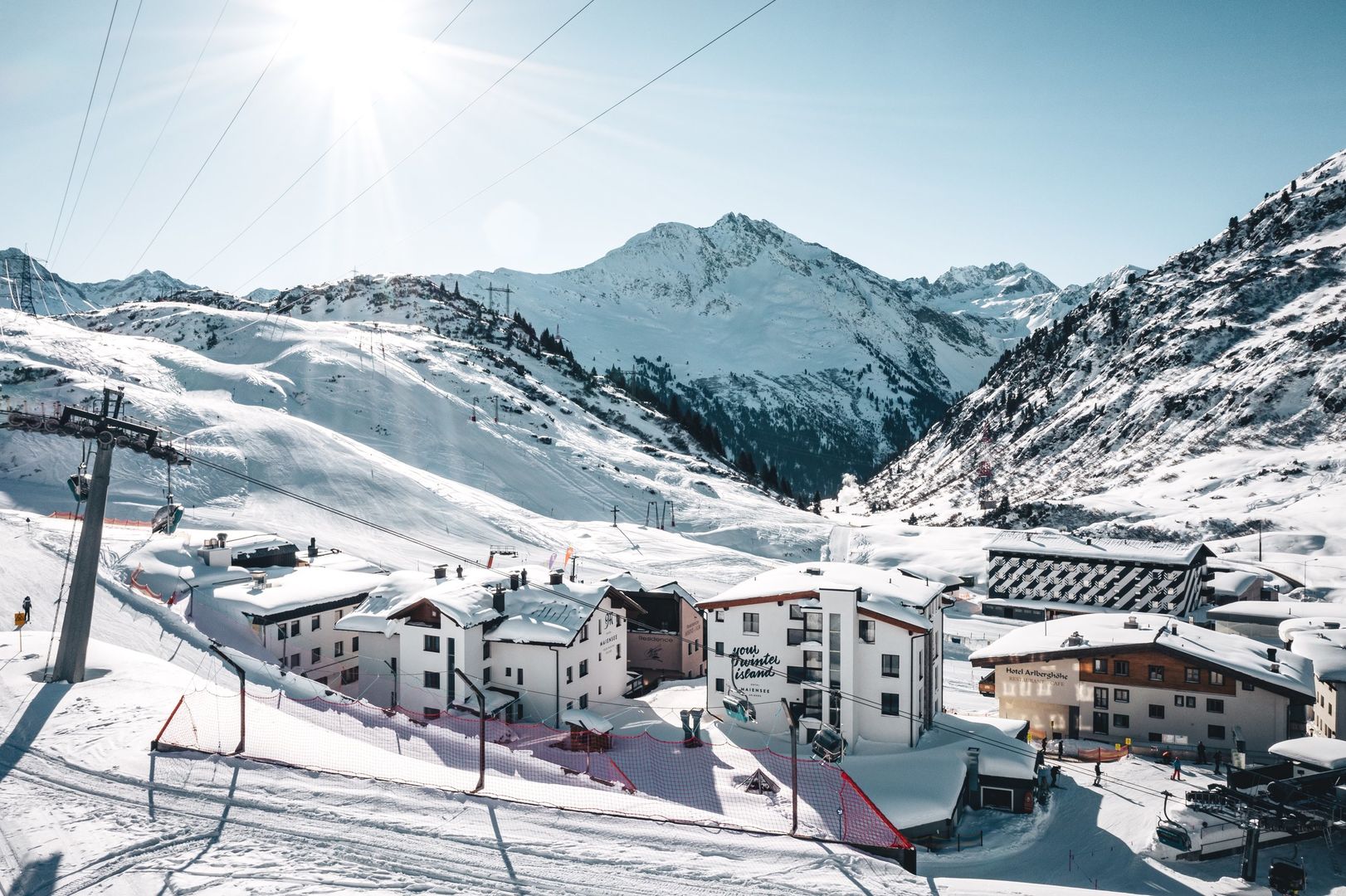 The family-run 4-star Hotel Maiensee - Ski in & Ski out is located right next to the chairlift (St. Christophbahn valley station) and on the ski piste in the winter sports resort of St. Christoph am Arlberg. A ski bus stop is just 50 metres away. In good snow conditions it is possible to ski down to the house. The village of St. Anton am Arlberg is about 7 km away and a cross-country ski trail is about 14 km away.