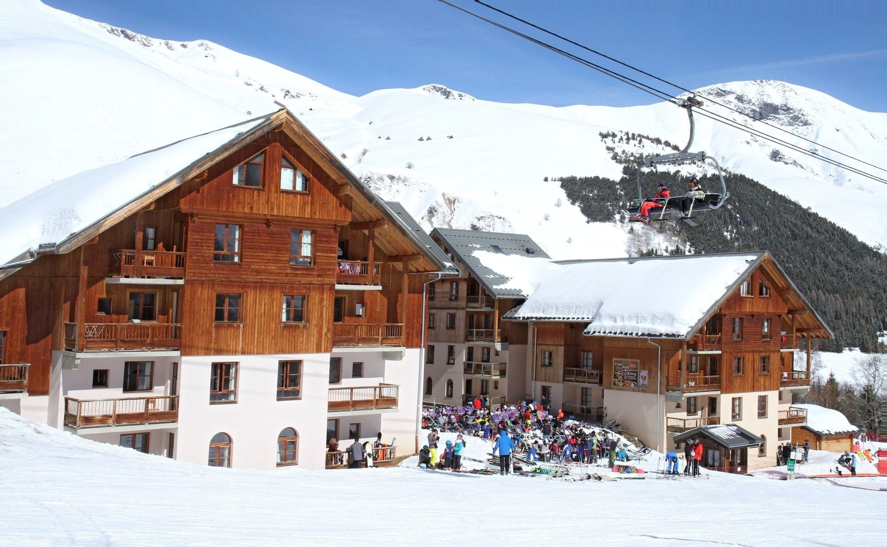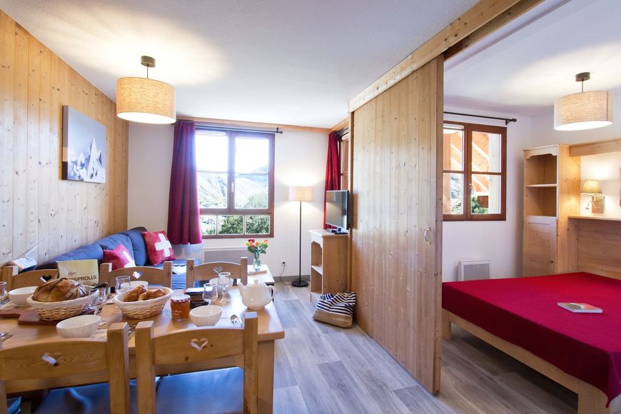 The cosy Résidence L'Orée des Pistes is situated in an ideal location, directly on the piste that ends at the valley station (ski-in & ski-out!). Restaurants, bakeries, bars and shops can be reached within just a few metres, and the resort centre is approx. 1 km away. The ski bus stops directly at the accommodation and takes you not only to the lift, but also to the resort centre.