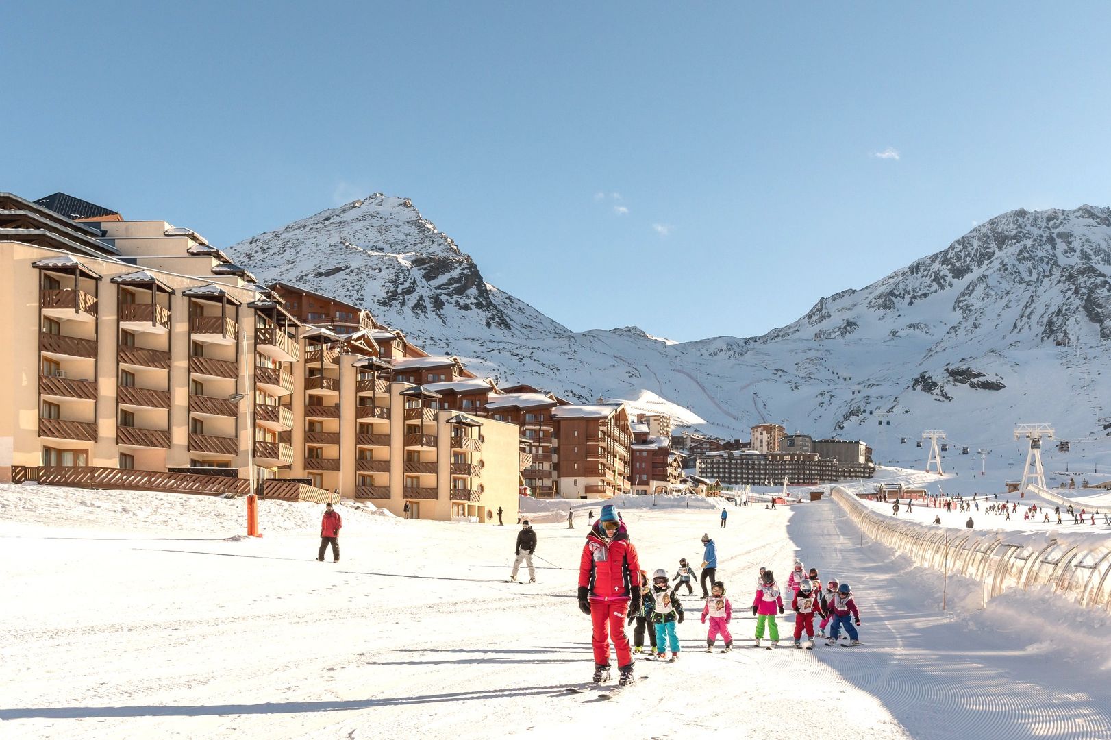 The cosy Résidence Les Temples du Soleil is situated in an ideal location in Belleville, directly on the piste and approx. 950 m away from the resort centre of Val Thorens with its numerous shops and restaurants.